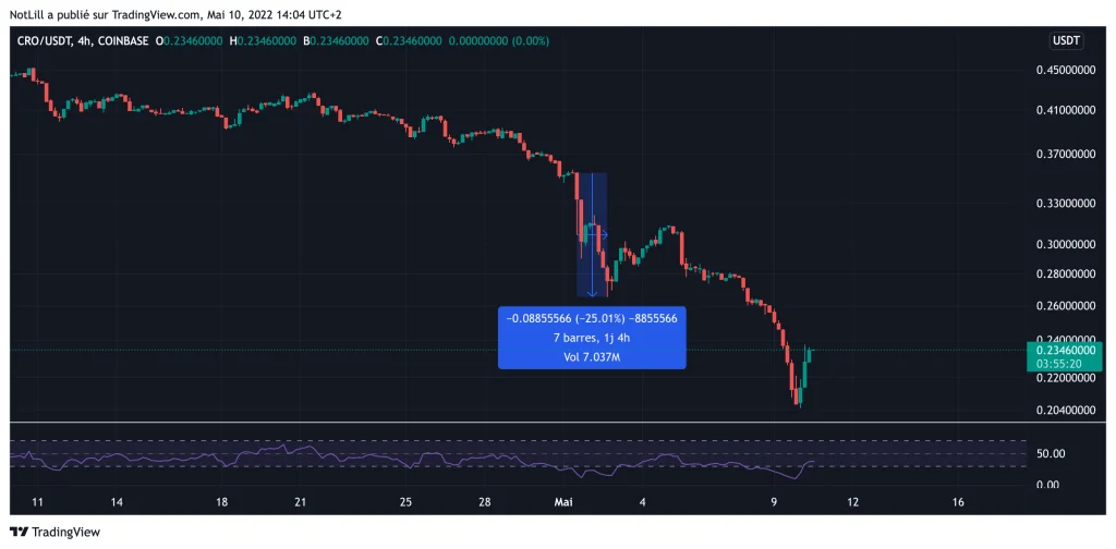 Les réactions ne se sont pas faites attendre du côté de la communauté. Le cours du CRO a tout simplement dégringolé de 25% en l’espace de 24 heures, comme le montre le graphe ci-dessous :